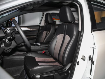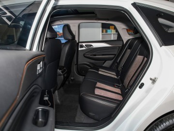 - Минималистичный салон с двумя 12.3-дюймовыми экранами, сиденьями из ткани или искусственной кожи, вентиляцией для задних пассажиров и люком.